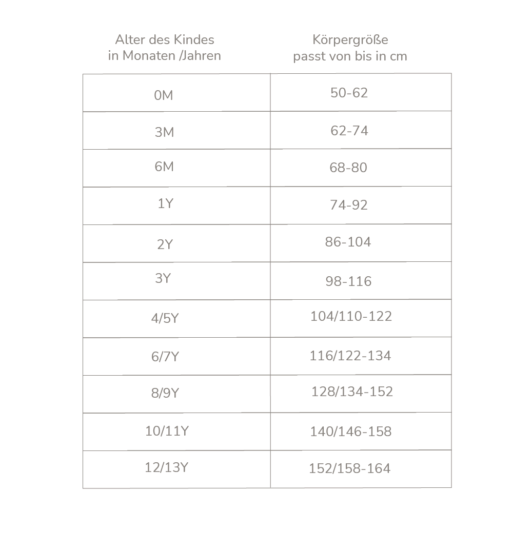 Unsere Kinderkleidung ist so geschnitten, dass sie mindestens 1 Jahr, teilweise aber auch 2-3 Jahre mitwächst. Damit sich dein Kind von Anfang an darin wohlfühlt, helfen wir dir gern dabei, die passende Größe zu finden.